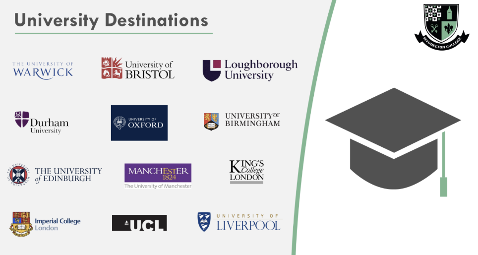 - นักเรียนส่วนใหญ่ได้รับการตอบรับจากมหาวิทยาลัยในกลุ่ม Russell Group ซึ่งเป็นมหาวิทยาลัยชั้นนำของสหราชอาณาจักร