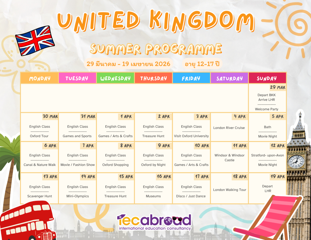 สำหรับน้องๆ ที่อาจยังไม่พร้อมไปเรียนเต็มเวลาที่ St. Edward’s School สามารถเข้าร่วม Summer Program ในเดือนเมษายน 2026 เพื่อเป็นโอกาสให้น้องๆ ได้ลองใช้ชีวิตและเรียนในสภาพแวดล้อมแบบอังกฤษระยะสั้น หลักสูตรช่วงฤดูร้อนเน้นทั้งการเรียนภาษาอังกฤษ การพัฒนาทักษะการคิด การทำกิจกรรมกีฬาและศิลปะ ตลอดจนทัศนศึกษาไปยังสถานที่สำคัญใน Oxford และลอนดอน โปรแกรมนี้เหมาะสำหรับน้องๆ ที่ต้องการทดลองเรียนรู้ชีวิตในโรงเรียนประจำอังกฤษก่อนตัดสินใจสมัครเรียนต่อในระยะยาวต่อไปในอนาคต